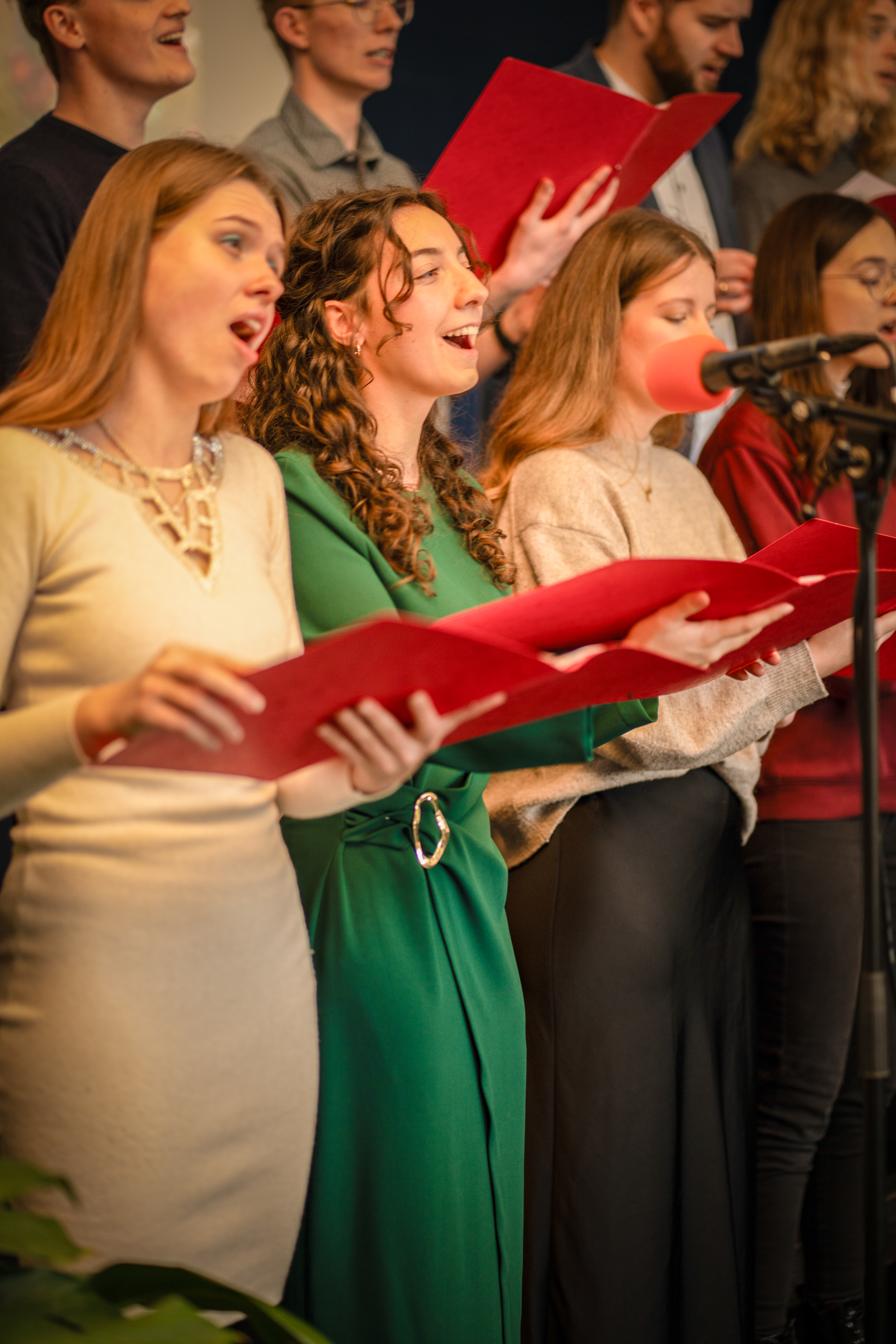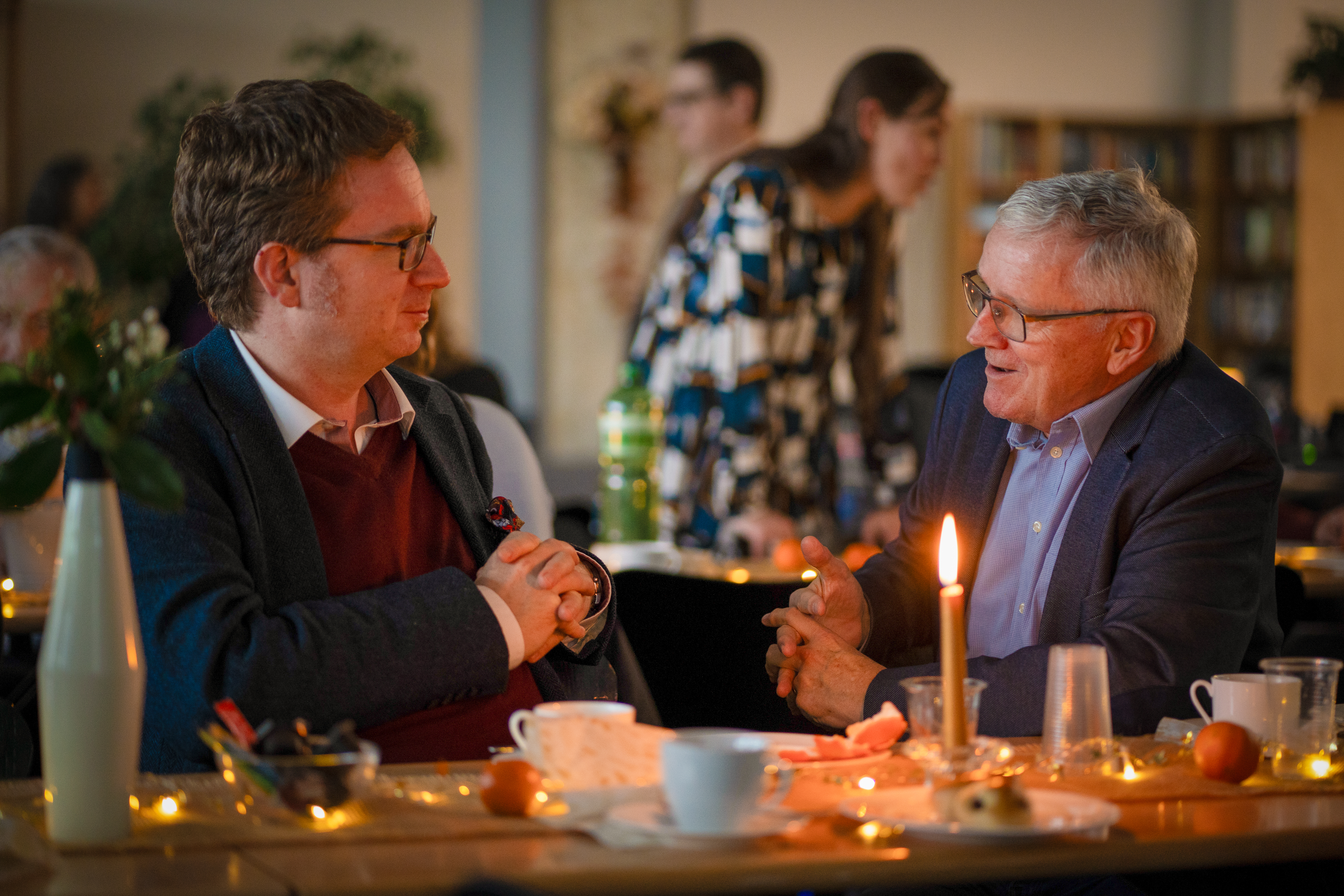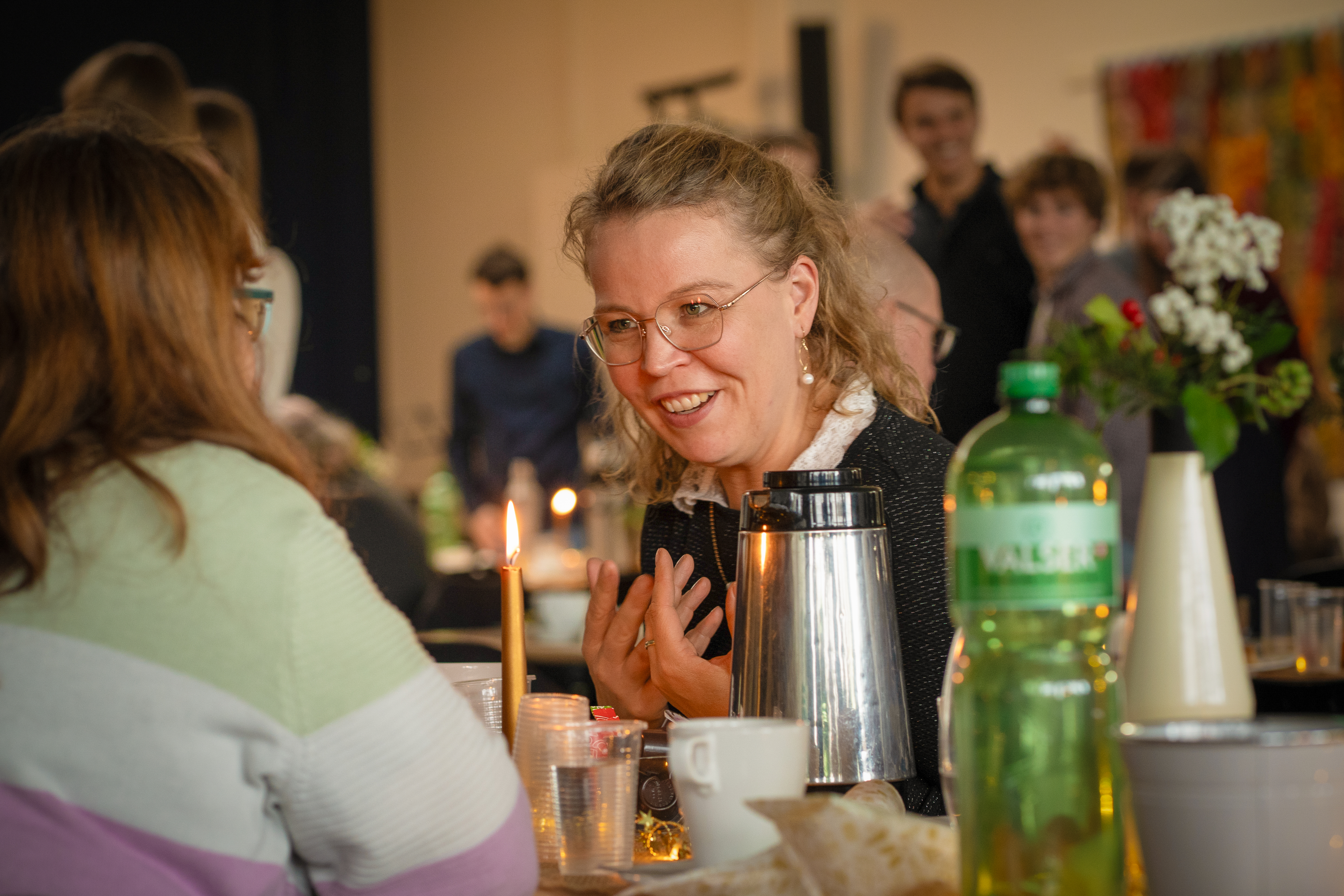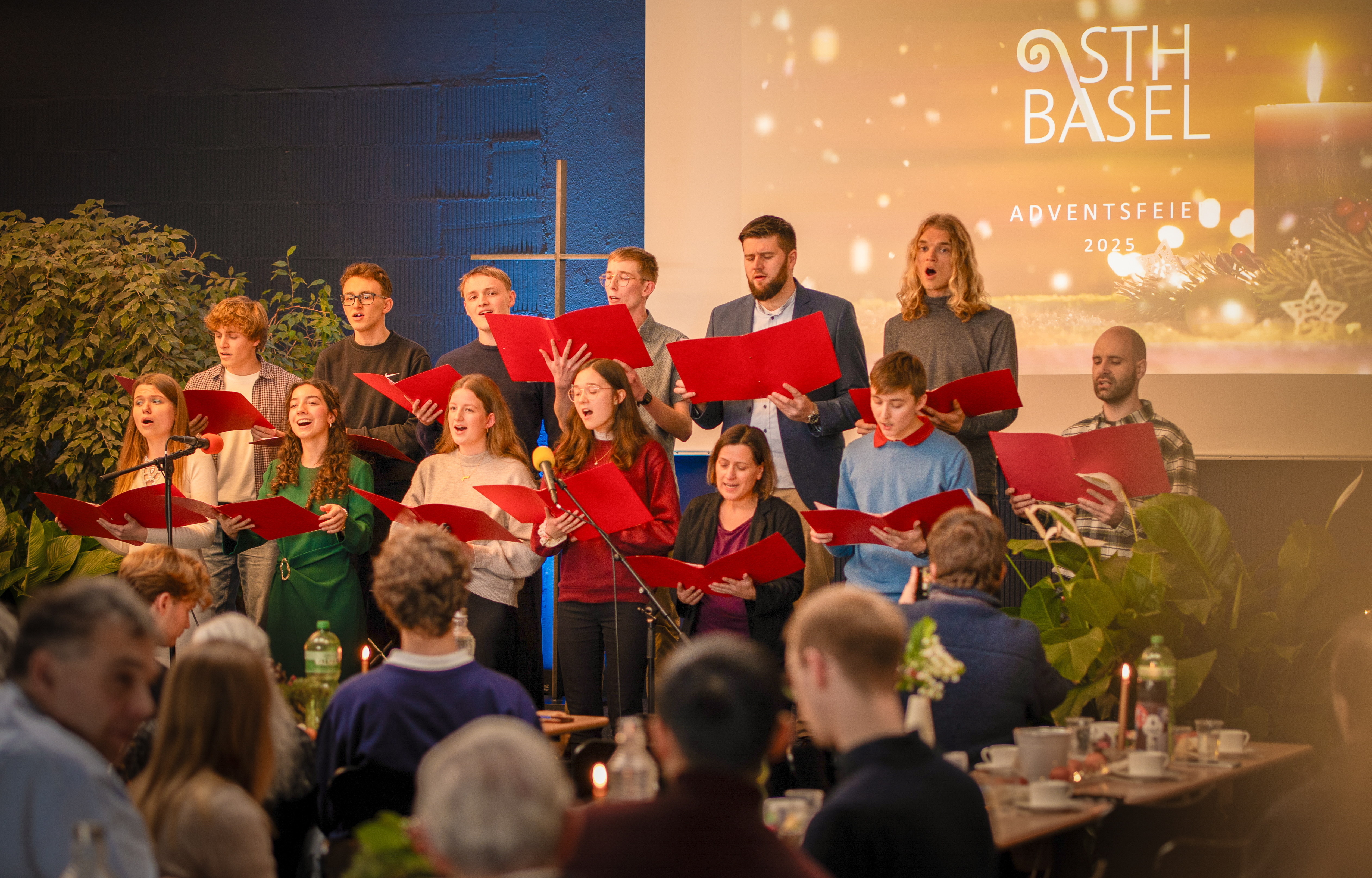 In warmer Adventsstimmung kamen am 5. Dezember 2025 im Cafe Prisma rund 110 Gäste aus dem Umfeld unserer Hochschule zusammen, um das Jahr 2025 gemeinsam und dankbar ausklingen zu lassen. Bei leckerem Punsch und vielen persönlichen Gesprächen bereicherten die neuen Studierenden den Nachmittag mit einer lebendigen Vorstellung auf der Bühne.
